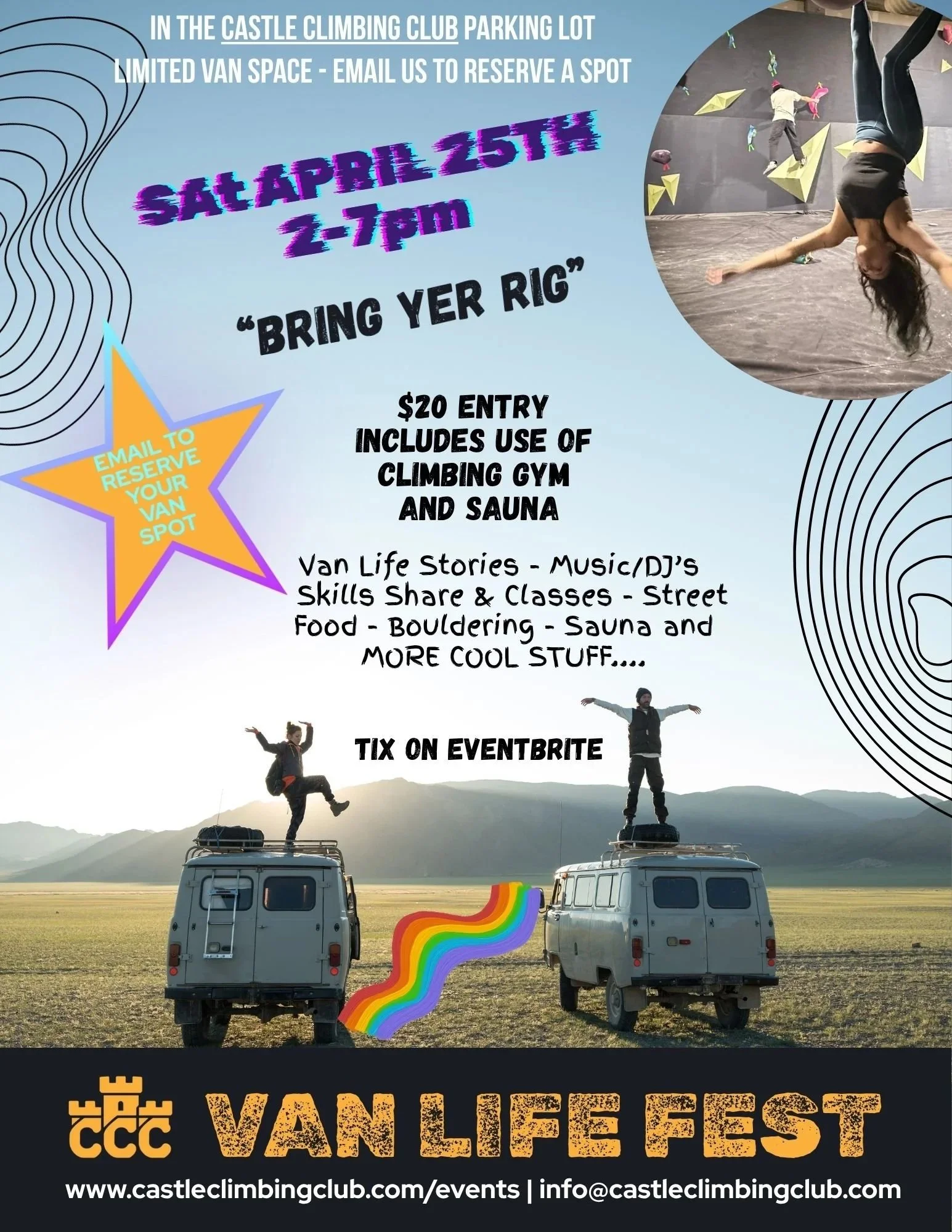 Back to All Events VAN LIFE FEST Saturday, April 25, 2026 2:00 PM 7:00 PM Google Calendar ICS EMAIL US TO RESERVE A SPOT FOR YOUR VAN - INFO@CASTLECLIMBINGCLUB.COM BUY TIX HERE Bring yer rig! Swop van life stories, skills share & classes, bouldering, sauna, street food, music & DJ’s. Tix $20 includes access to the Climbing Gym and Sauna and all the fun stuff!